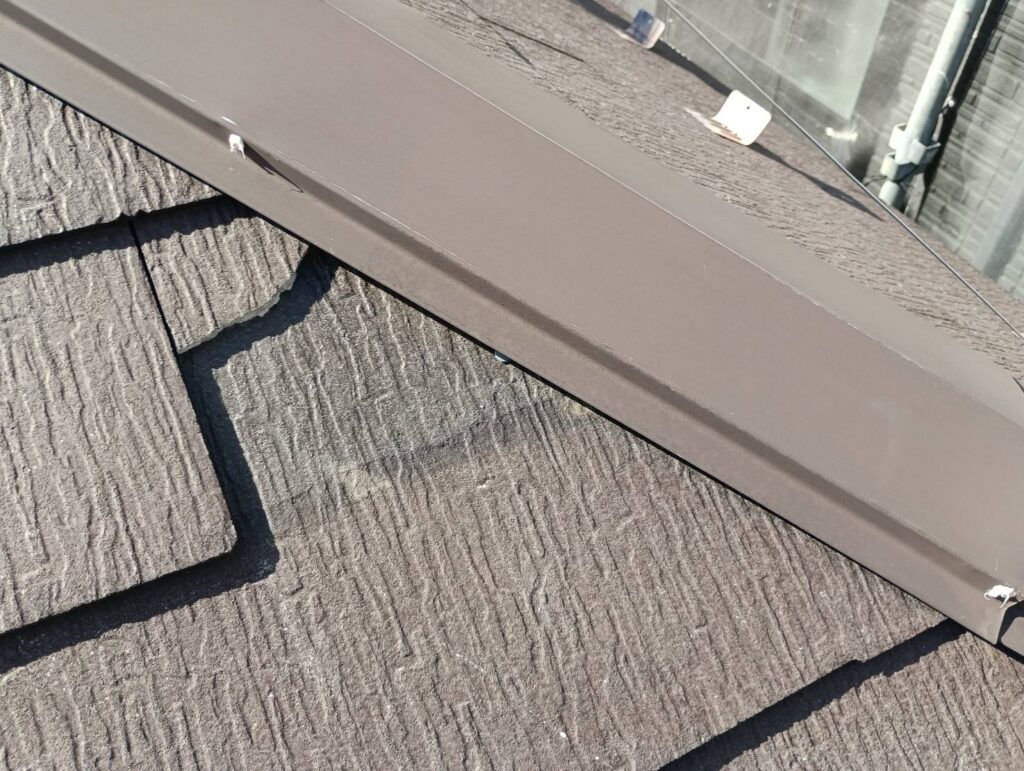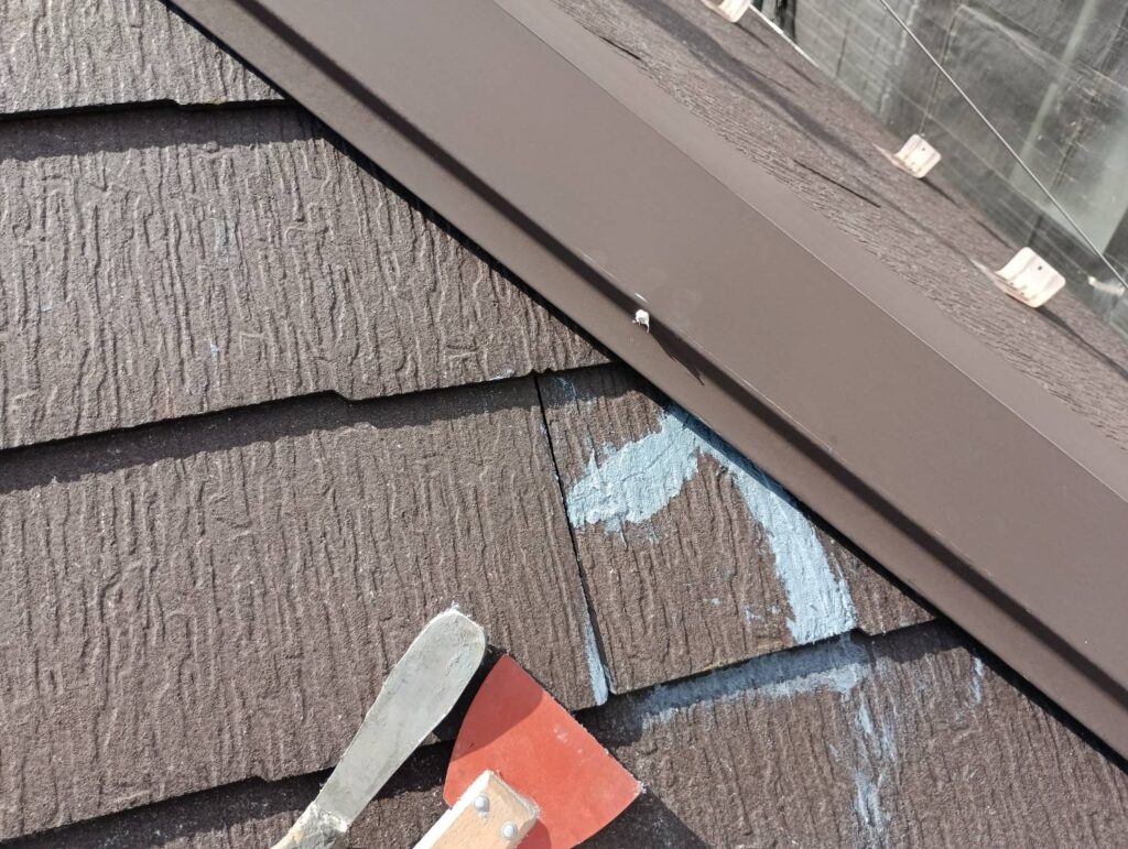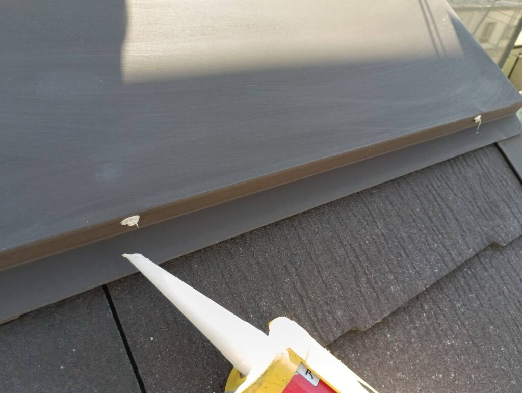 屋根板金の釘頭にはいつも通りシーリングで抜け難い対策を、一枚割れて剥がれ落ちていた箇所は屋根ボンドできっちり固定などなど、まずは下地からしっかりやっていきます^_^